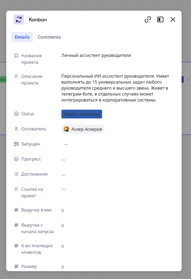 Каждый стартап на доске - отдельная карточка. В заголовке сразу всё важное: название проекта, имя основателя и месяц старта. Это ваша визитка внутри сообщества. Видно сразу, без лишних пояснений.